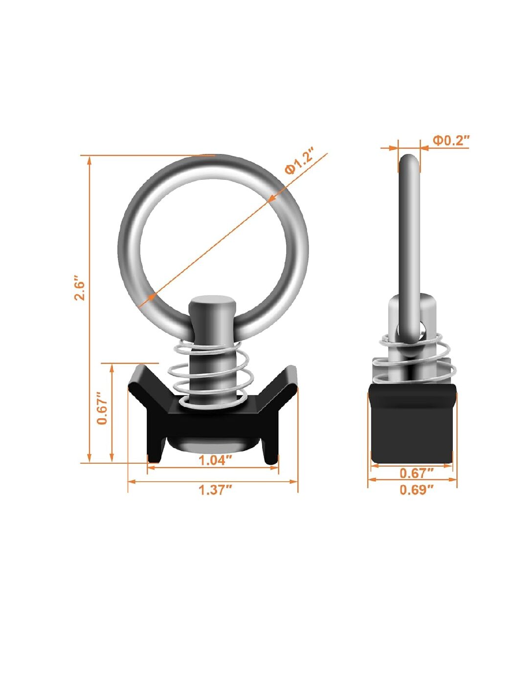 This is a versatile L-Track fitting for anything from light duty to medium duty applications. This fitting features a large stainless steel O-Ring which accepts a wide variety of hooks, and straps. The base is a black powder coated finish to resist corrosion.